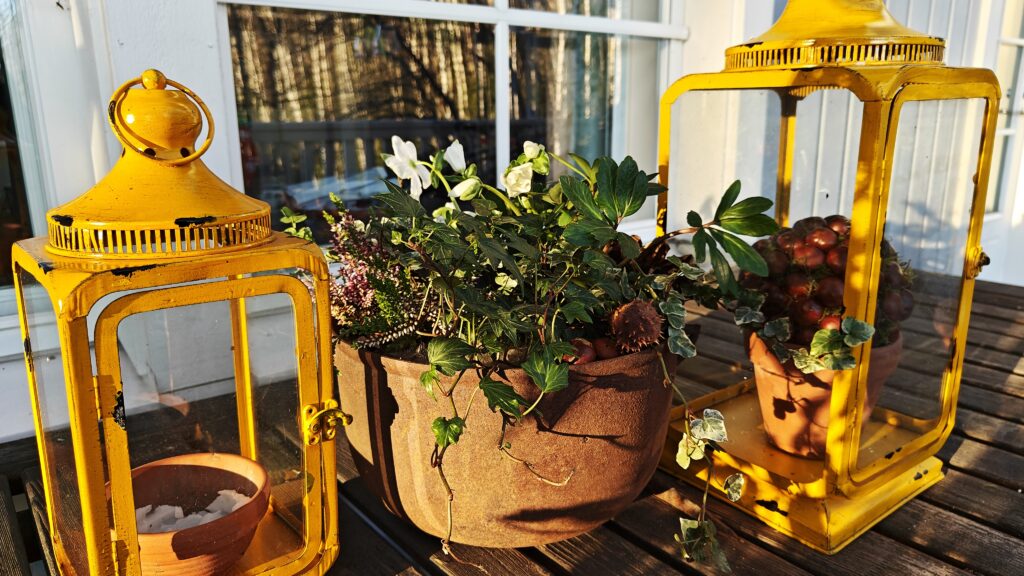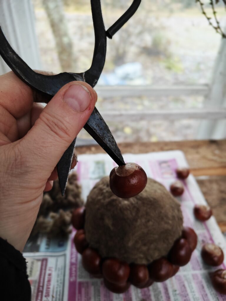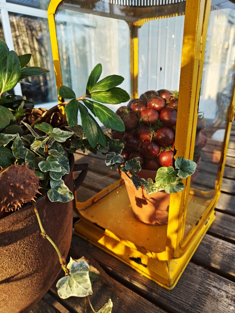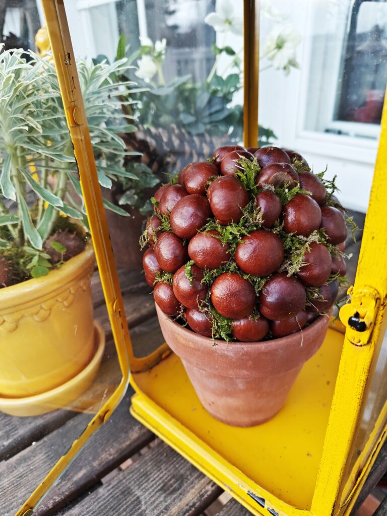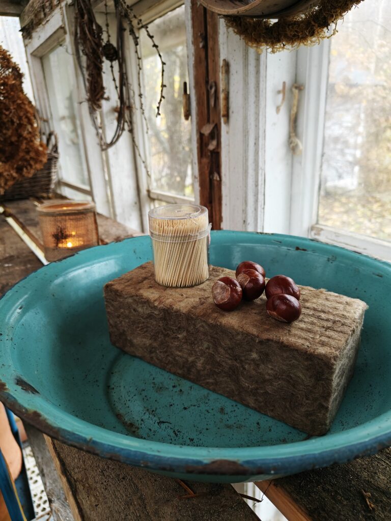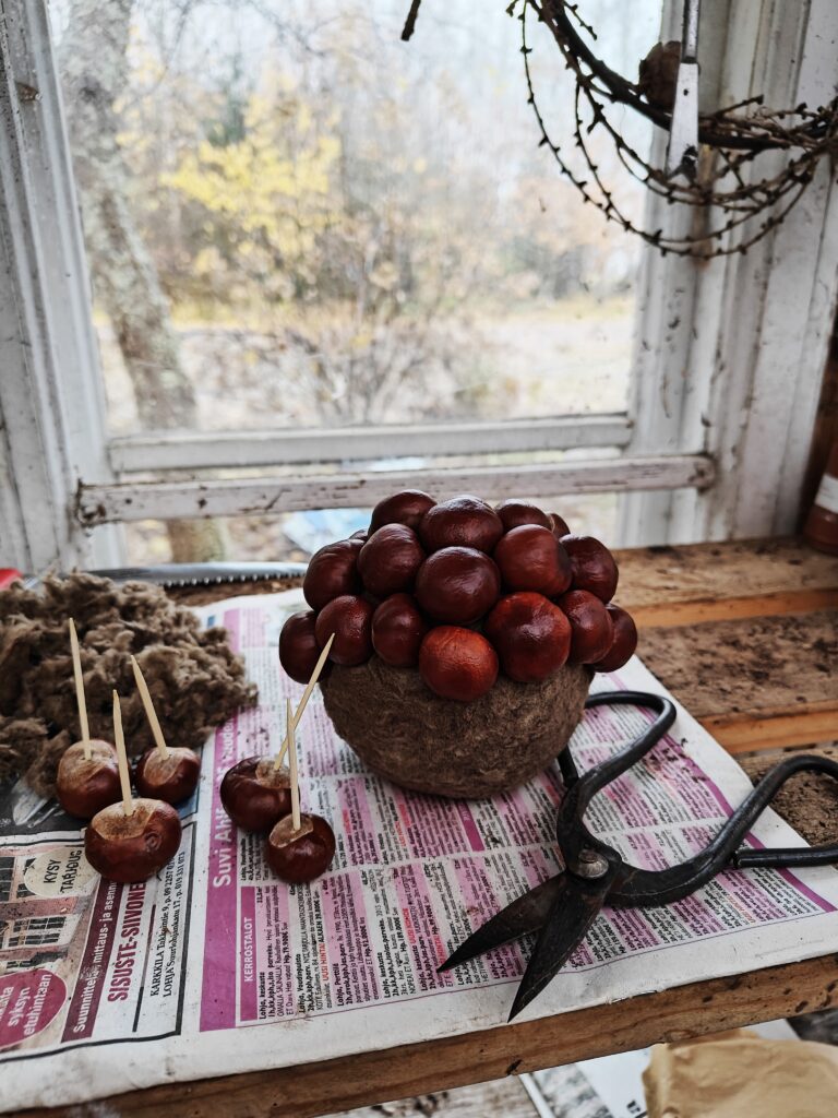 Blogi Mama’s garden Askartelua luonnonmateriaaleista — kastanjapallo Perinteet on luotu jatkuviksi, joten eipä tänäkään vuonna tehdä poikkeusta. Marraskuun saapuessa alkaa mielessäni aina itämään siementen sijaan kaikenlaiset askartelut, joilla voin koristella kuihtuvaa puutarhaa ja kodin ikkunanäkymiä. Olen käynyt jo usean vuoden ajan keräämässä läheisen puiston nurmikolta kastanjoita. Niitä on puun alla niin paljon, että kymmenessä minuutissa on ollut kassissa tarvitsemani määrä. Tosin oma hevoskastanjanikin varttuu kovaa vauhtia, joten joskus toivon olevani kastanjoiden suhteen täysin omavarainen. Kastanjat ovat todella kauniita käyttää ihan vain kukka-asetelmienkin koristeena. Tosin tintit nakuttelevat niitä mielellään mutta samallahan siinä tulee ruokkineeksi myös puutarhan lintuja. Tintit nakuttelevat myös kaikenlaisia muovisia koristeita, joten niitä kannattaa välttää. Väriä saa asetelmiin vaikkapa ruusun kiulukoilla tai värikkäillä puuhelmillä. Helmet voi maalata halutessaan myös kasviväreillä. Kastanjapallon materiaalit. Kompostoituvasta kukkasienestä syntyi helposti pallon muotoinen. Kompostoituva märkäsieni Halusin pallosta täysin kompostoituvan, joten käytin pohjana uudenlaista kukkasientä perinteisen oasiksen sijaan. Sen jälkeen kun tajusin, että tuo oasis on melkoinen mikromuovin lähde, en olekaan sitä enää ostanut. Tähän luonnonmateriaaliin onnistuvat ihan yhtä hyvin kaikki vahvavartisilla materiaaleilla pistetyt asetelmat ja sitä on yhtä helppo muotoilla kuin vihreää oasista. Ammattilaisilta olen kuitenkin kuullut, että hentovartisten kukkien asettelussa tämä ei ole vielä yhtä hyvä kuin perinteinen kukkasieni. Itse olen ratkaissut tämän siten, että asettelen hennompivartiset kukat kanaverkosta muotoiltuun palloon. Toki kanaverkkopallo ei pysy märkänä muuten kuin johonkin astiaan veden kanssa laitettuna. Tähän minulla on kuitenkin mielessä eräs ihana idea, jonka näin vanhasta englantilaisesta puutarhaohjelmasta. Siinä tehtiin pallo rahkasammaleesta ja morsiuskimpun kukat työnnettiin palloon, ohueen rautalankaan yksittäin sidottuina. Rautalangoista muotoutui sitten pallon ja kukkien taakse kätevä kädensija, mistä kimppua kannatella. Rahkasammal säilytti kosteuden kukkien ympärillä ja ne kestivät kauniina koko päivän. Kastanjapallon työvaiheet Vaan takaisin kastanjapallon tekemiseen. Pallon muotoilussa käytin oksasahaa ja muotoillessa syntyneellä ylimääräisellä materiaalilla täytin pallon ylä- ja alapuolen vain painelemalla materiaalia käsin pallon pintaan. En kastellut materiaalia koska kastanjoille on ehdottomasti parempi säilyä kuivempana, muuten ne alkavat ajan myötä homehtumaan. Ilmavasti säilytettynä kastanjat kuitenkin säilyvät hyvänä jopa parikin vuotta. Sisälle en ole kuitenkaan koskaan kastanja-askartelujani tuonut, sillä luulen niiden kuivahtavan nopeasti ruman näköisiksi. Pitäisi kyllä joskus testata. Kastanjaan kannattaa paina reijän alkua ensin saksilla. Alkuun ähräsin hammastikkuja kastanjoihin ilman alkureikää mutta niin paljon se otti käsiin, että lopuille älysin jo pistää reijän alun saksilla. Se helpotti hommaa melkoisesti! Sitten vaan kastanjoiden asettelu palloon mahdollisimman tiiviiksi kerokseksi. Lopuksi jouduin vaihtamaan muutaman kastanjan vähän pienempikokoiseen, jotta kaikki mahtuivat olemaan tiiviisti paikoilleen asetettuina. Palapelien harrastamisesta voisi olla tässä työvaiheessa hyötyä, hieman joutui siis miettimään ja valitsemaan minkä kokoista kastanjaa laittoi vieretysten. Lopuksi tilkitsin vielä kastanjoiden välit sammaleella. Se sujui kätevimmin hammastikun avulla ja tiivisti mukavasti kastanjat vielä paikoilleen. Kuumaliimaakaan en halunnut tässä käyttää sillä muovia sekin valitettavasti on. Vaan eipä sitä olisi tarvinnutkaan, niin hyvin kastanjat lopulta asettuivat toistensa viereen. Ja ihan sopivan kokoinen saviruukkukin löytyi vielä pallon alle, joten en voisi olla tyytyväisempi lopputulokseen. Kastanjapallo on nyt lyhdyn sisällä turvassa lintujen nokkaisuilta. Laitoin niille viereiseen kukka-asetelmaan reilusti nokittavaa ja pöydällekin muutaman kastanjan ruokailua varten. Siitäpä tulikin mieleeni, että nyt kun meillekin satoi pieni kerros lunta, on taas aika aloittaa talvilintujen ruokinta. Ainakin kotimaisella talimakkaralla ajattelin tämän talven ruokkia. Hieman vielä mietinnässä jättäisinkö ulkomaisen auringonkukan nyt kokonaan pois ruokalistalta. Kauraa harkitsen auringonkukan tilalle, vaikka kaikille se ei ilmeisesti oikein maistukaan. Loppuun vielä eilen ottamani kuva terassilta. Greippini siinä paistattelee viimeistä päivää marraskuisessa auringon paisteessa. Illalla kannoin sen sisälle ja tuossa se nyt työpisteeni vieressä murjottaa liian lämpimässä ja kuivassa huoneilmassa. Usein olen miettinyt vieväni sen kellariin talveksi mutta en ole kuitenkaan vielä uskaltanut. Toisaalta siellä talvehtivat hyvin myös muut välimeren kasvit mm. oliivipuu, joten mikseipä greippikin. Nytkin vaan kävi niin, että kellari täyttyi eilen viimeistä paikkaa myöten ja vähän ylikin, joten sisälle taas tuli sitten greippi tuotua. Kaunista marraskuista sunnuntaita kaikille lukijoilleni💛 Share to: facebook Share to: twitter Share to: pinterest Julkaistu 16.11.2025 Kommentoi Lue kommentit (0) Ei ole kommentteja. Lähetä kommentti Peruuta vastausNimi * Sähköpostiosoite * This site is protected by reCAPTCHA and the Google Privacy Policy and Terms of Service apply.Kommentti * Mama's garden Puutarhanhoitoa Mamman puutarhassa ja intoilua kaikesta vihreästä. Häärään täällä Ib vyöhykkeellä, tonttimme koko on reilut 5000 m2, josta vajaa puolet on luonnontilaista kalliota. Facebook Instagram Pinterest mammanpuutarha@gmail.com Arkisto 2025 (25) 2024 (26) 2023 (28) 2022 (46) 2021 (54) 2020 (72) 2019 (49) 2018 (47) 2017 (68) Kategoriat Valitse kate