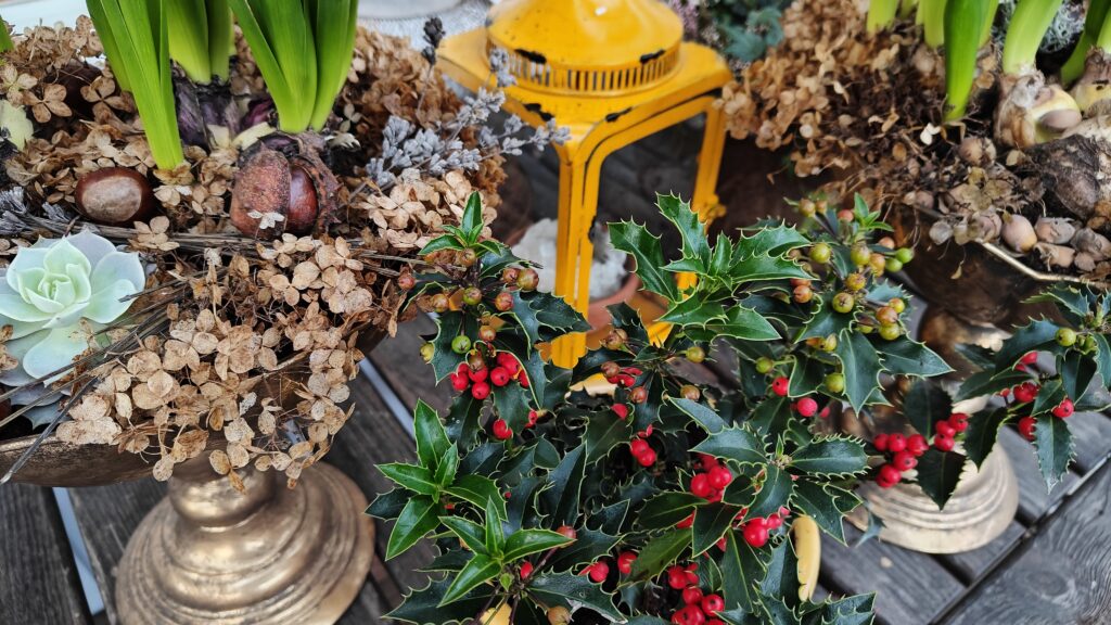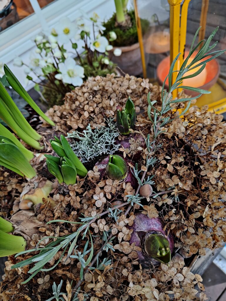 Blogi Mama’s garden Blogi Koristekasvit Vihersisustus Jouluisia istutuksia — koristeet löytyivät puutarhasta Viimeinen viikonloppu ennen aattoa on ollut jokseenkin täynnä kaikkea. Kahteen päivään mahtui pieni toimenpide naistenklinikalla, kuusen ja jouluruokien haku, sekä tänään vierailu Nummelle Saarelman puutarhalle hyasinttejä hakemaan. Kiireisiä päiviä mutta niin täynnä tunteita ja päällimmäisenä iloa. Iloitsin onnistuneesta toimenpiteestä ja ennen kaikkea tänään tästä ihanasta säästä ja mahdollisuudesta puuhailla vierailun jälkeen jouluistutusten parissa terassilla. Kuinka ihanaa kun ulkona on niin lämmintä, että siellä tarkenee hyvin puuhastella. Myös asetelmien kasvit säilyvät siellä paljon kauniimpina kuin kuivassa sisäilmassa. Toki olen varautunut ilmojen mahdolliseen kylmenemiseen mutta siihen asti nautin kasveista ulkona ja keittiön ikkunasta silloin kun olen sisätiloissa. Aatoksi ja pyhiksi nostan kuitenkin osan asetelmista myös sisätiloihin. Tällä hetkellä sisällä oleva hyasintti vetelee viimeisiään, joten kyllä sisälle on jouluksi saatava lisää huumaavaa sintin tuoksua. En voinut vastustaa tätä kaunista orjanlaakeria. Se kestää myös hieman kylmää, joten on senkin tähden hyvä valinta ulkoasetelmiin. Asetelmien kasveina Multiflora hyasinttejä Lähdin hakemaan puutarhalta ainoastaan Multiflora hyasinttejä mutta tarttuihan sieltä sitten muutakin mukaan. Ale-pöydältä löytyi lisäksi kaksi kaunista jalallista istutusastiaa, jotka näin heti näiden suloisten hyasinttieni kantajina. Tuo Multiflora taitaa muuten olla vähän sellainen varjeltu salaisuus. Aikaisemmin olen mielestäni lukenut, että hyasintin sipulia käsitellään jollakin tavalla, jotta se jakautuisi ja muodostaisi rykelmän pieni ja herkkiä hyasintin kukkavarsia. Nyt sipulien kasvattajan sivuilla kuitenkin luki, että useita pieniä hyasintin sipuleita liitetään yhteen. No niin tai näin, ihania ovat joka tapauksessa. Olen myös vuosien myötä laittanut merkille, että nämä Multiflorat jaksavat kukkia puutarhassa vuodesta toiseen paljon paremmin kuin tavalliset ison kukkapatukan omaavat hyasintit. Hyasinttien lisäksi valitsin asetelmiin kaksi kaunista mehiruusuketta. Ne eivät pakkasia kestä. Siispä laitoin ne samaan asetelmaan, jonka otan sitten heti sisälle mikäli lämpötilat alkavat putoamaan. Mullan pinta peittyi hortensian kukinnoilla Aikaisemmin olen suosinut asetelmissani sammalta multapinnan peittämiseen mutta tällä kertaa käytin sitä mitä oli saatavilla. Sammaleet jäi syyslomalla hakematta, enkä hennonut repiä niitä puutarhasta. Istutusastian sävy johdatteli lopulta käyttämään kuihtuneita pallohortensian kukintoja. Ne ovat kauniita myös puutarhassa talventörröttäjinä mutta alimpia kukkia hennoin kuitenkin leikata. Kiinnitin kukinnot alustaan rautalangasta taivuttamillani hakasilla. Ilman kiinnitystä tuuli veisi ne kyllä mennessään. Laitoin kulhoihin myös syksyllä keräämiäni punapähkinän pähkinöitä ja hevoskastanjan kastanjoita. Kastanjat kiinnitin alustaan hammastikuilla. Pahoin pelkään, että nämä herkut saattavat kuitenkin kadota joulun pyhinä parempiin suihin. Tinttien ainakin on ollut tapana käydä tutkailemassa asetelmiani. Vaan eipä se haittaa, ihanaa jos niistä on iloa myös puutarhan linnuille. Hortensioiden lisäksi puutarhasta löytyi edelleen kauniina säilynyttä ja huumaavan hyvälle tuoksuvaa laventelia. Tein varsista ja kuihtuneista kukinnoista pieniä kimppuja jotka kiinnitin mullan pintaan hakasilla. Oli kyllä todella ihanaa työstää laventelia näihin asetelmiin! Saimikin tuli katselemaan mamman puuhasteluja. Laitan tähän loppuun vielä muutamia tunnelmakuvia Saarelman puutarhalta. Oli niin mukavaa käydä moikkaamassa omistajia ja nähdä vihdoin myös Riikan tupa. Sain myös kuulla tuvan mielenkiintoisesta historiasta ja sen asukkaista. Kiitos ystävällisyydestänne❤️ Ja hei oikein ihanaa ja rauhallista joulua kaikille lukijoilleni. Pian vaihtuu myös uusi puutarhavuosi ja päästään aloittamaan se edelleen yhdessä. Kiitos vielä kaikille tästä kuluneesta vuodesta. Niin ihanaa on saada jakaa näitä omia puutarhapuuhia teidän kanssanne. Olkoon uusi puutarhavuosi meille kaikille iloinen ja hedelmällinen💚 Share to: facebook Share to: twitter Share to: pinterest Julkaistu 21.12.2025 Avainsanat asetelmia hyasintti joulukukka jouluvalmistelut kukka-asetelma vihreä joulu Kommentoi Lue kommentit (8) Kiitos sinulle hienoista postauksista kuluvan vuoden aikana. Kunhan vatsa on täytetty jouluherkuilla, siirrymmekin odottamaan lähestyvää kevättä. Toivotan sinulle oikein hyvää ja rauhallista Joulua ja Onnellista Uutta Vuotta 2026! Vastaa Kiitos itsellesi kun jaksat käydä täällä lueskelemassa❤️ Minun joulun pyhien ohjelmana onkin käydä kaikki bloggerin vanhat kamut läpi ja päivittää heidän kuulumisiaan. Vastaa Kauniita asetelmia! Mukava kuulla, että kaikki on hyvin. Hyvää joulua! Vastaa Kiitos ja nyt riennän sun blogiin päivittämään kuulumisesi❤️ Vastaa Hianoja, jouluusia asetelmia! Hyvää joulua! Vastaa Kiitos samoin sinulle❤️ Vastaa Kiva idea laittaa hortensian kuivuneita kukintoja multapinnan katteeksi! Ja ihanaa uutta puutarhavuotta 2026 sinulle! Vastaa Kiitos itsekin tuohon niin tykästyin🤎 Säilyvät yhtä kauniina sisällä kun ovat jo valmiiksi kuivuneet ulkona. Sammal ei sisälle tuotaessa pysy kovin kauan sellaisena samettisena. Kait sitä voisi yrittää suihkuttamalla vähän freesata kyllä. Ihanaa uutta vuotta myös sinulle ja koko perheelle puutarhaa unohtamatta💚 Vastaa Vastaa Peruuta vastausSähköpostiosoitettasi ei julkaista. Pakolliset kentät on merkitty *Nimi * Sähköpostiosoite * This site is protected by reCAPTCHA and the Google Privacy Policy and Terms of Service apply.Kommentti * Lähetä kommentti Peruuta vastausNimi * Sähköpostiosoite * This site is protected by reCAPTCHA and