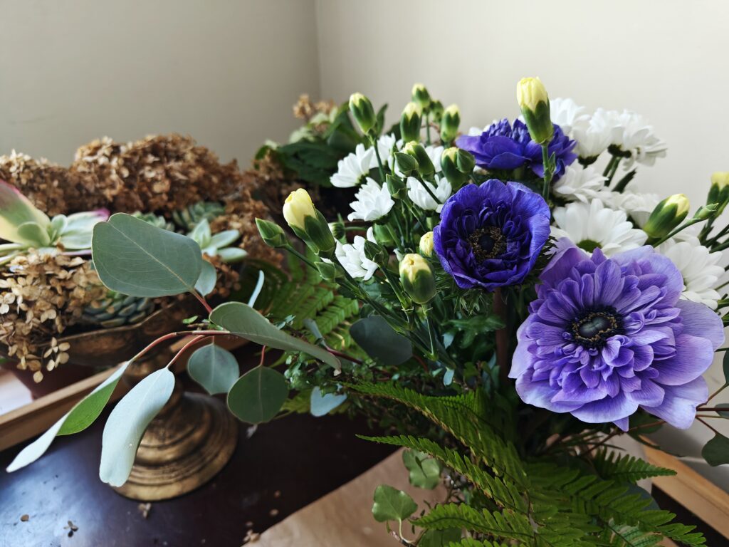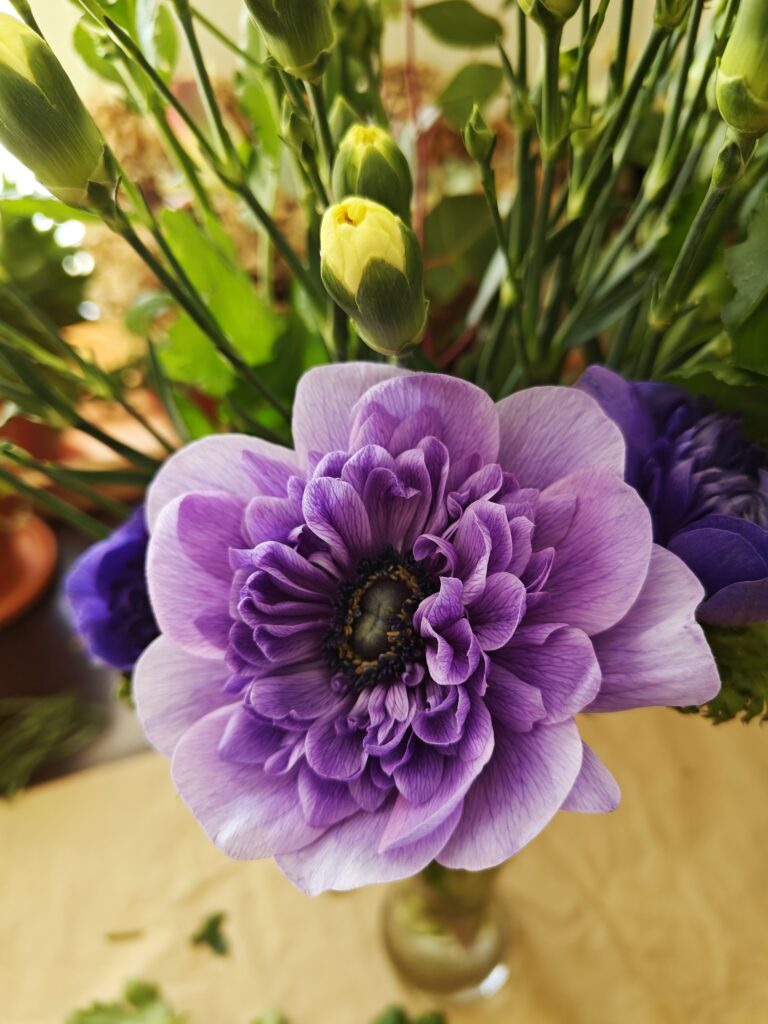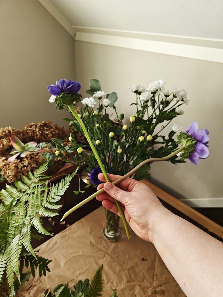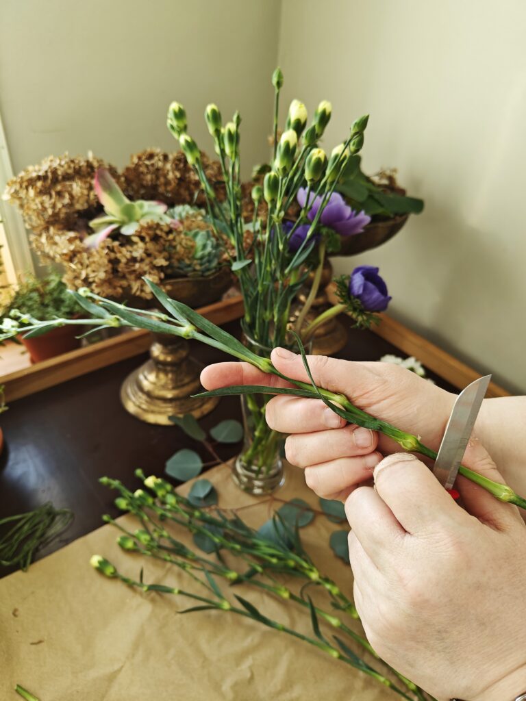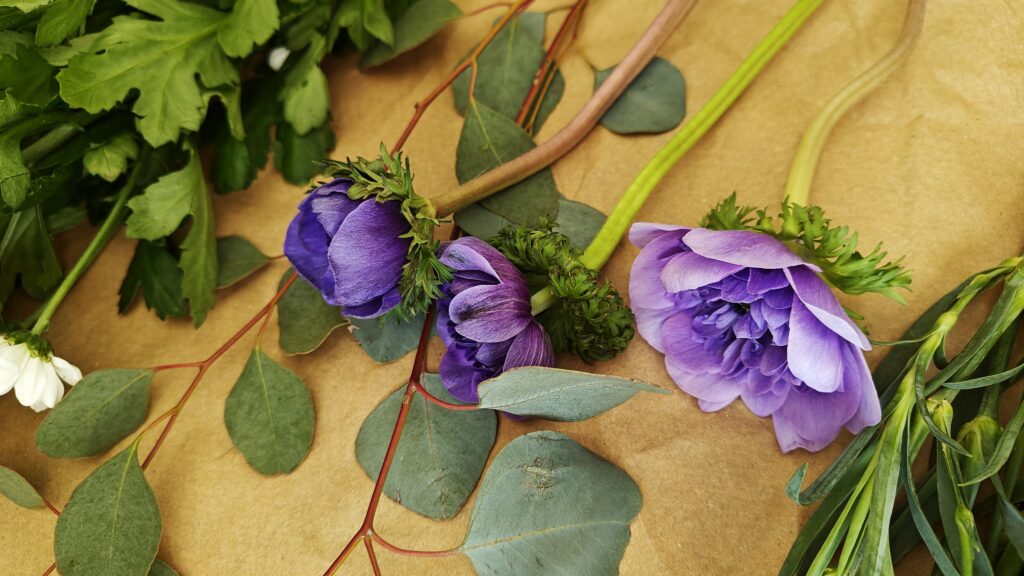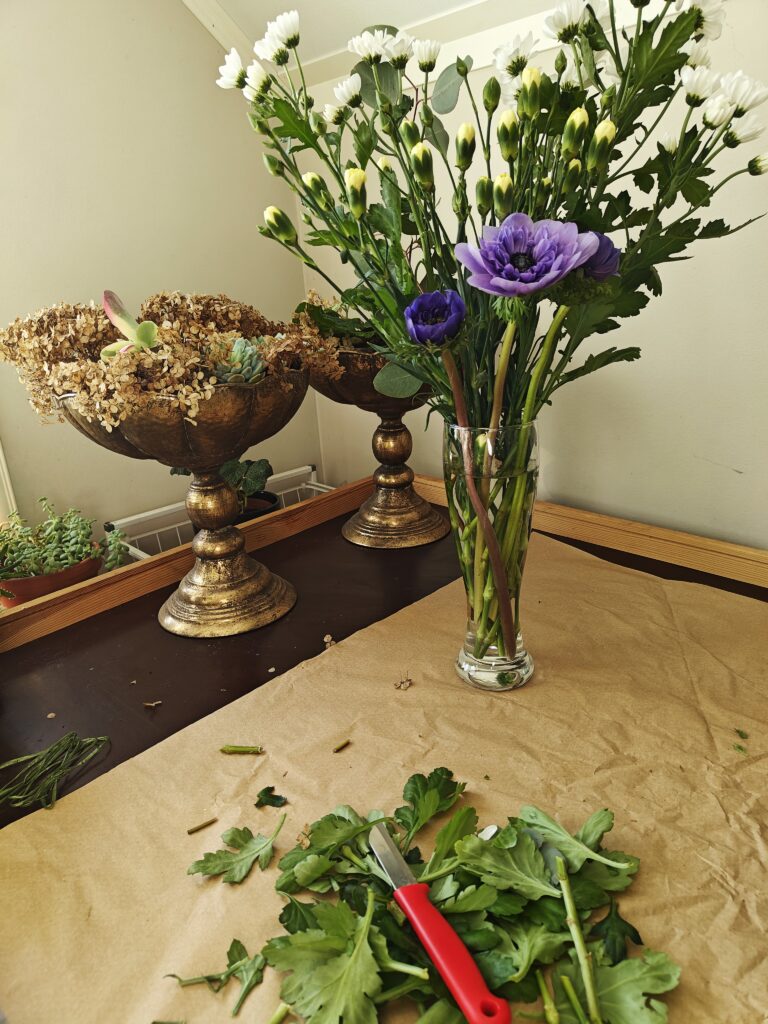 Blogi Mama’s garden Blogi Vihersisustus Leikot spiraaliin — kukkakimpun sitominen Kaipasin kirjallisia ohjeita kimpun sitomiseen, enkä YouTube:n lisäksi sellaista oikein löytynyt joten päätin sitten tehdä sellaisen. Joten tässäpä nyt sitten hakukoneelle löydettäväksi ihan uusi ohje-postaus kukkakimpun sitomiseen spiraalitekniikalla. Ja sain muuten tästä tosi kivasti hyvän syyn lähteä tänä aamuna hakemaan sylillisen leikkoja. Kartoitin samalla meidän lähimarketin leikkotarjontaa, sillä meillä on työporukan kanssa suunnitteilla oma kimppukurssi. Kyllähän se vielä kukkakaupan kautta oli pyörähdettävä, jotta sain kimppuuni jotakin sykähdyttävää pääkukaksi. Tiedän, että pitäisi kannattaa marketin sijaan oikeita kukkakauppoja, mutta minulla ei ainakaan ole siihen aina oikein varaa. Tällä tavalla ostoksia jakamalla saan sekä runsaan kimpun, että kannatettua myös sitä paikallista ihanaa kukkakauppaa. Kruunuvuokko, Anemone coronaria hurmasi minut tällä kertaa kukkakaupan valikoimasta. Kukkien valinta ja kuljettaminen Kukkien valintaan kannattaa käyttää hieman aikaa. Kannattaa ensin valita ne kimpun kauneimmat pääkukat ja vasta sitten miettiä mitkä sopisivat tukemaan niiden kauneutta. Itse tein tänään väärin päin ja kirkkaan valkoiset krysanteemit eivät lopulta niin hyvin kimppuun mielestäni istuneetkaan. Krysanteemit ovat hyviä kestoltaan mutta niiden jäykkä ja pönäkkä olemus on vaikea saada asettumaan kimppuun kauniisti. Jatkossa taidan jättää sen kokonaan pois kimpuistani. Onneksi keltainen terttuneilikka vuorostaan sopi erittäin hyvin yhteen kruunuvuokon tummaan violetin sävyyn. Kukkien lisäksi tarvitaan tietysti myös vihreää. Nykyään marketeista saa mm. ihania eukalyptusnippuja, joita olen joskus hankkinut myös kranssitarpeiksi. Ne säilyvät pitkään kauniina ja säästän ne aina lopulta kuivakukiksi. Minulla on muuten nyt ensimmäistä kertaa ollut eukalyptuksen taimi kellarissa talven yli ja se näyttää voivan oikein hyvin! Joten jatkossa pyrin olemaan entistä omavaraisempi kimpuissa tarvittavan vihreän suhteen. Vihreän kimppuuni löysin kellarista. Nyt ei tarvinnut enää pakkasista huolehtia mutta tärkeää on tietysti talviaikaan, ettei kukkaset palellu matkalla kaupasta kotiin. Markettien kukkien kanssa olet ns. omillasi. Onneksi kauppojen yhteydessä on kuitenkin pakkauspisteitä, joissa voi ostoksensa itsekin kääräistä pakettiin. Kovalla pakkasella käärepaperia tarvitaan paljon, jopa neljästä viiteen kerrosta! Kukkakauppojen käyttämä ohut silkkipaperi muuten suojaa kukkien herkkiä terälehtiä hankautumilta. Sitä ei markettien pakkauspisteillä taida olla laisinkaan. Kukkakaupasta kukat saa aina ammattilaisen pakkaamana ja monille se jo itsessään ratkaisee päätöksen ostopaikasta. Oletko muuten tiennyt, että talvella kukkapakettia ei saakaan avata heti kun tulet kotiin? Paketti annetaan rauhassa ensin lämmetä ja vasta sitten aukaistaan. Kaikenlaiset nopeat muutokset stressaavan kukkasia ja niiden kesto heikkenee. Jokaisen leikon vartta lyhennetään muutaman sentin verran veitsen tyvellä vinottain vetäisten. Imupintojen leikkaamista voi muuten harjoitella vaikka talventörröttäjillä! Kukat kaupasta kotiin vaan mitäs seuraavaksi? Mikäli sidot muutamankin kukkakimpun vuodessa itse, kannattaa hankkia omaksi oikea kukkaveitsi. Sillä saa nimittäin vedettyä leikkoihin hyvät imupinnat. Imupinta vedetään kaikilla muilla leikoilla vinoon mutta tulppaaneilla se on suora. Tulppaanien ei yleensä toivota kasvavan pituutta ja suora imupinta hillitseen sitä. Keittiösakset kannattaa unohtaa koska ne litistävät varsien päät, eivätkä kukat enää pysty kunnolla imemään maljakosta vettä. Tilasin kukkakurssilaisille saksalaiset veitset ja niille tuli hintaa kolmisen euroa kappaleelta. Testasin tänään yhtä ja veitsi oli todella hyvän tuntuinen käytössä. Eli kolmella eurolla pääsee jo harrastuksen alkuun. Ja mikäli sitoo vain omista kukista niin muita kustannuksia ei sitten tulekaan. Miten ihanan edullinen harrastus voikaan parhaimmillaan olla tämä kukkasten kanssa puuhailu! Kukkakimpun tekemiselle kannattaa muuten miettiä jokin hyvä paikka kodissasi. Sellainen missä voit käsitellä kukat niin, etteivät ne imupintoja leikatessa tökkää vaikkapa edessä olevaan jääkaapin oveen. Jos olet vasenkätinen niin pitelet kimppua oikeassa kädessäsi. Silloin luonnollisesti otat kukat pöydältä joka on vasemman kylkesi puolella. Maha pois pöydältä, sanoi opettaja meille ohjeeksi koulun leikkokukkaviikolla! Kukat kunnostettuna odottamaan sidontaa. Leikkojen lepohetki ja maljakon valinta Kun sitten olet käynyt leikkoniput läpi niin ne kannattaa ennen sidontaa antaa olla jonkin aikaa maljakossa imemässä vettä. Uusilla imupinnoillaan ne hörppivät vartensa täyteen kädenlämpöistä vettä. Vanha tapa laittaa puuvartiset kuumaan veteen taitaa olla jo uusilla tutkimuksilla kumottua tietoa. Pääasia, että maljakon vettä vaihtaa muutaman päivän välein tai ainakin silloin kun se näyttää silmin nähden likaantuneelta. Myös jatkuva vaihtaminen voi stressata kasveja. Ja imupintoja leikkauksen yhteydessä leikoista poistetaan muuten reippaasti alimpia lehtiä. Lehdet eivät saa jäädä spiraalin pyörteisiin, eivätkä olla kosketuksissa maljakon veteen. Maljakoita kannattaa hankkia eri kokoisia. Kaikki kimput eivät sovi pitkään ja kapeaan vaasiin vaan on hyvä omistaa myös ainakin yksi matala ja pullea maljakko. Ja kun itse sidot kimpun niin maljakon valinta kannattaa tehdä heti aluksi ja sitoa kimppu juuri siihen kyseiseen malliin sopivaksi. Spiraali sijoittuu noin 1/3 kohtaan kukan pituudesta. Lopuksi pidempien kukkien varsia voi tasoitella veitsellä samaan mittaan. Pitkien kukkien varsi kannattaa kuitenkin hyödyntää. Ei ole järkevää ostaa kalliimpia pitkiä kukkia ja sitoa niistä pientä pyöreää kimppua. Joko nyt päästäisiin