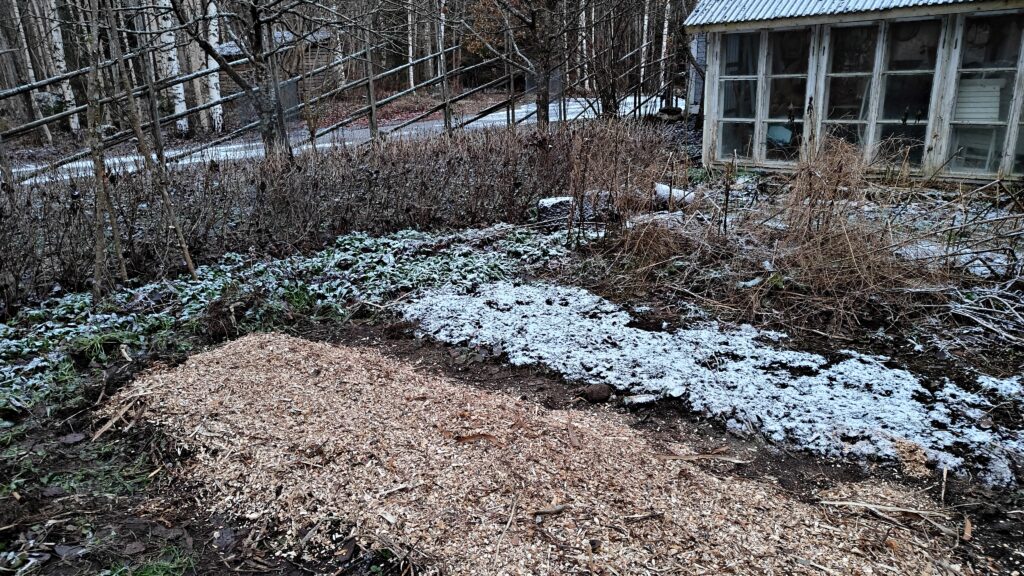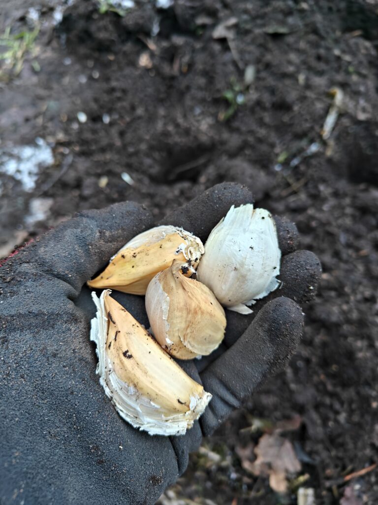 Tieto joka minulle on tästä kasvista kerääntynyt, on lähes yksinomaan peräisin Gardener’s World:stä ja itse Yhdistyneen kuningaskunnan pääpuutarhurilta, Monty Donilta. Hän on kovasti kehunut tätä elephant garlic-nimistä, miedosti valkosipulille maistuvaa jättikokoista sipulia ja viljelee sitä itse tavallisen valkosipulin tapaan joka vuosi. Kynnet istutetaan loka-marraskuun vaihteessa mutta itse laitoin ne nyt vasta tällä viikolla, heti kun sain lähetyksen. Vähän myöhäiseen ajankohtaan nyt istutus meni mutta laitoin kynnet aika syvälle ja katoin penkin lehtipuun hakkeella. Vielä voisin haravoida läheisten omenapuiden alta vähän lehtiäkin lämmikkeeksi. Pelkään, että syy miksei tätä meillä yleisesti kasvateta voi piillä kasvin talven kestossa. Siksi peittelen istutuksen nyt huolellisesti ja toivon lauhaa talvea.