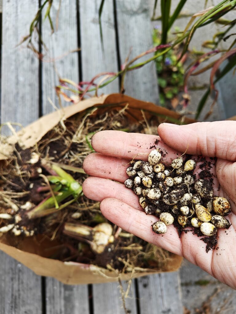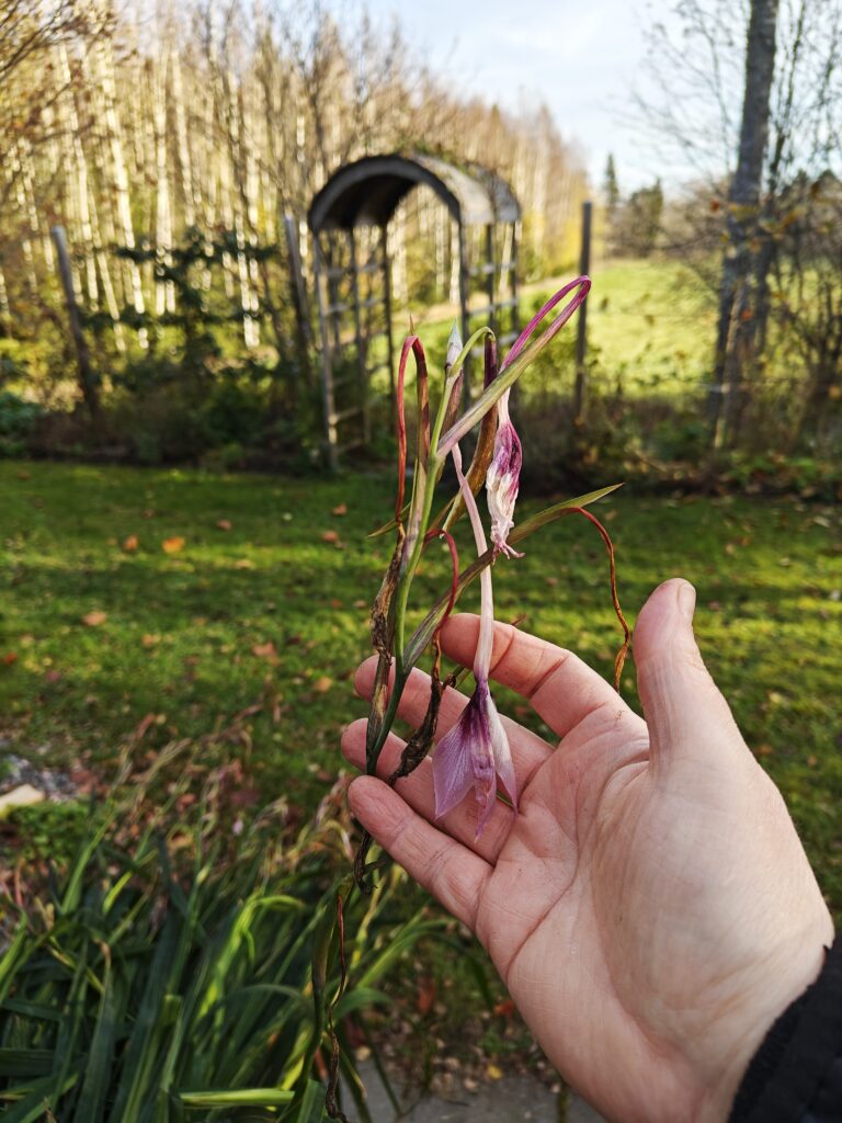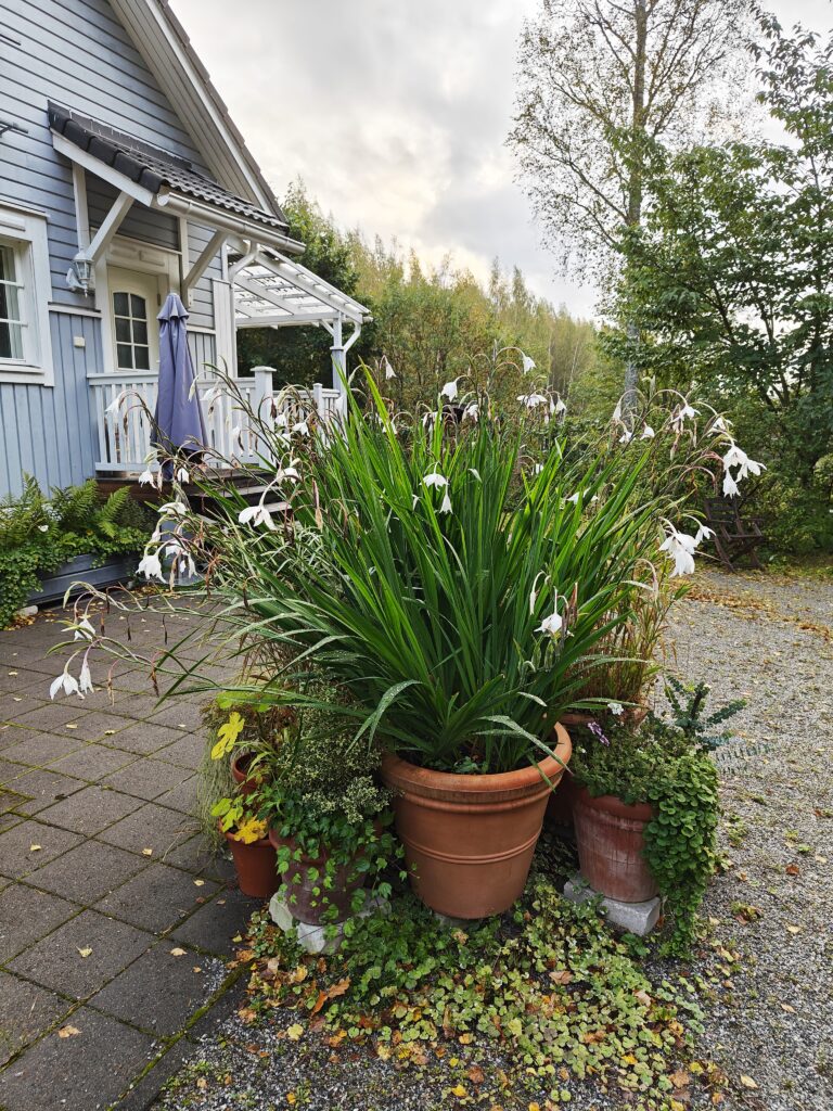 Blogi Mama’s garden Blogi Koristekasvit Nyt talteen tuoksumiekkaliljat ja muut Vaikka viikonvaihteen yöpakkasen ja hallat purivatkin Etelä-Suomea myöten niin vielä ei ole ollenkaan liian myöhäistä nostaa talteen esimerkiksi tuoksumiekkaliljojen sipuleita tai daalioita. Muutaman yön pakkaset eivät vielä maata lopullisesti kovettaneet ja nyt kun on taas lauhaa ja lämmitä öisinkin niin sipulit ja mukulat saa viimeistään loppuviikosta helposti nostettua talteen. Eli vaikka kasvien varret menivätkin pakkasöinä täysin kuolleen näköisiksi, eivät maanalaiset osat kuitenkaan kuole, vaikka mullan pinta kävisikin jo kohmeessa. Pakkasyöt lopettivat tuoksumiekkaliljojen kukinnan. Viikonlopun aurinkoinen sää sai minut daalioiden nostopuuhiin ja kellarinkin täyttymään hyvää vauhtia. Nyt onkin jo lähes kaikki ruukkupuutarhan kasvit kellarissa, vaikka ei niillä vielä kiire edes olisi ollut. En kuitenkaan halua ruukkujen enää kastuvan seuraavissa sateissa, joten siellä ne nyt ovat talviresidenssissään. Vain muutama puuvartisia kasveja sisältävä ruukku odottelee vielä lehtien putoamista ulkosalla. Ihan parastahan se olisi jos olisi vaikkapa autokatos mihin nostaa ruukut ensin sateelta suojaan kuivahtamaan mutta sellaisen puuttuessa olen sitten vienyt ne suoraan vain kellariin. Kasvihuoneen kautta kierrättäminen keväiseen tapaan tuntuu liian vaivalloiselta. Jostain syystä keväällä sen jaksan kuitenkin oikein hyvin tehdä. Päin vastoin haluan tähän aikaan vuodesta alkaa tyhjentämään kasvihuonetta, sillä pian tarvitsen tilaa marraskuisiin askarteluihini. Toivottavasti ilmat pysyvät nyt plussan puolella ainakin jouluun asti. Askartelu on paljon mukavampaa kun kädet pysyvät lämpiminä. Sipulit olivat lihoneet kesän aikana suuriksi vaikka en liiemmin muistanut niitä edes lannoitaa. Viikolla nostin tuoksumiekkaliljat Tuoksumiekkaliljojen nosto venyi viime vuonna itselläni ihan liian myöhäiseksi ja oli siinä ja siinä, että sain vielä sipulit irti ruukuista. Nyt päätin olla hyvissä ajoin liikenteessä ja kaivaa sipulit ylös vielä hyvän sään aikaan. Sipulit kuitenkin kasvoivat ja kukkivat oikein hyvin, joten vaikka viime vuonna maa oli jo pinnalta jäässä, ei se siis vaikuttanut sipulien laatuun sitä huonontavasti. Joskus olen antanut vihreiden varsien ja lehtien lakastua sisällä, ennen niiden leikkaamista irti sipulista. Jo useana vuonna olen kuitenkin leikannut varret pois jo muutama päivä nostosta. Ovathan lehdet jo paleltuneet ja menettäneen rakenteensa, joten tuskin pystyvät enää kuljettamaan mitään sipuliin päin. Eli samantien vaan varret poikki ja kompostiin niin pääsee paljon helpommalla. Paperikassi on mielestäni paras talviajan paikka näille tuoksumiekkaliljan sipuleille. Ja vaikka toin sisälle pelkät sipulit niin niitäkin tuli yksistään kolme paperikassillista. Tosin ne eivät olleet täyteen tupattuja, sillä paremmin sipulit kuivahtavat kun ovat ohuempana kerroksena kassien pohjalla. Nyt vein ne ensin lattialämmityksen päälle kylppäriin mutta pian siirrän sipulit yläkertaan hieman normaalia huoneenlämpöä viileämpään makuuhuoneeseen. Kellarissa olen myös kerran yrittänyt talvettaa mutta siellä mätänivät kaikki piloille. Silloin harmitti koska sama kanta oli ollut minulla vuosia kasvamassa ja menetin sen. Olisi ollut järkevämpää vaikka puolittaa sipulimäärä sisälle ja ulos kellariin. Nämä minisipulit otan myös talteen. Kasvavat vuosi vuodelta kokoa ja kenties lopulta kukkivatkin. Daalioille kokeilen nyt lampaanvillaa Talvensuojaturve olisi hyvää väliainetta daalian juurakoille, sillä maakellarini taitaa mennä talvisin niille vähän liian kylmäksi. Turve myös imisi itseensä liian kosteuden. Turvetta yritän kuitenkin käyttää mahdollsimman vähän. Olen kovasti yrittänyt löytää uusia luonnonmukaisia ja kestävän kehityksen mukaisia materiaaleja juurakoiden säilyttämiseen. Olen kokeillut sanomalehteen käärimistä ja pelkkää sanomalehdellä peittämistä. Viime talveksi nostin laatikoita kellarin ylemmille hyllyille ja se tuntui olevan lattiatasoa parempi ratkaisu. Tänä vuonna kuitenkin haluan kokeilla juurakoiden päälle ja väleihin myös kerrosta lampaanvillaa. Työkaveri lupasi tuoda sitä siskonsa lammastilalta ja siitä innostuin heti innovoimaan. Jos villaa jää yli niin laitan sitä myös sammalpallojen sisälle sekoitettuna maa-aineksiin. Pidättäisikö se kesällä kosteutta paremmin palloissa ja sammaleet viihtyisivät entistä paremmin?! Tuota on ehdottomasti kokeiltava. Lampaanvillan kauriita karkoittavaan ominaisuuteen suhtaudun hieman skeptisesti. Aluksi tehoa voi jonkin verran ollakin mutta kun kauriit tottuvat villan tuoksuun, sateet huuhtovat sitä ja lumi peittää alleen niin enpä uskaltaisi luottaa pelkästään siihen. Kyllä runkosuojat ja verkot vaan ovat se ainoa ja varma keino estää vauriot. Tuoksumiekkaliljat kukkivat yhtä jaksoisesti heinäkuun lopusta viime viikonloppuun asti. Verkkojen laittaminen onkin toisaan sitten seuraavana työlistalla. Toivottavasti ensi viikonloppunakin on kaunis sää niin saan ne kenties parissa päivässä paikoilleen. Ennen sitä perjantaina on kuitenkin juhlan aika, sillä paikallinen Lohjan puutarhaseura täyttää 90 vuotta. Seuran jäsenet on kutsuttu juhliin Åsvallan seurantalolle. Kahvittelun lomassa kuullaan mielenkiintoisia puheenvuoroja ja kuunnellaan kaupunginorkesterin soittajia. Odotan iltaa innolla, ihanaa päästä kuuntelemaan puhetta puutarhasta. Share to: facebook Share to: twitter Share to: pinterest Julkaistu 21.10.2025 Avainsanat daalia Dahlia Tuoksumiekkalilja Kommentoi Lue kommentit (0) Ei ole kommentteja. Lähetä kommentti Peruuta vastausNimi * Sähköpostiosoite * This site is protected by reCAPTCHA and the Google Privacy Policy and Terms of Service apply.Kommentti * Mama's garden Puutarhanhoitoa Mamman puutarhassa ja intoilua kaikesta vihreästä. Häärään tä