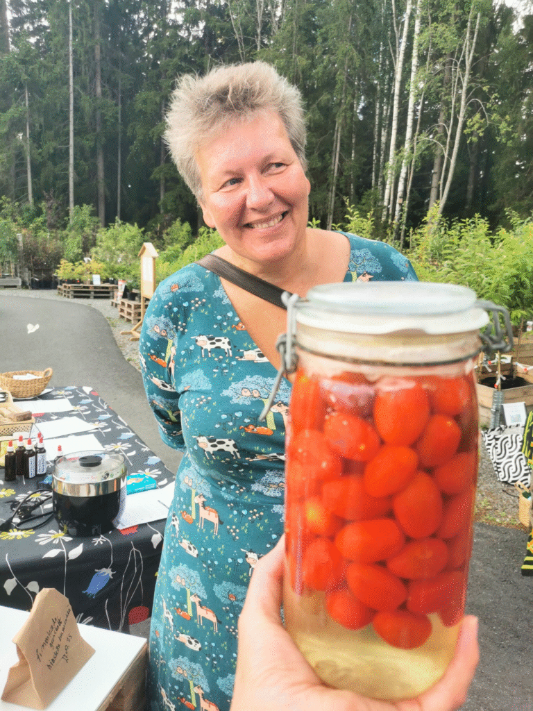 Blogi Somepuutarhuri Johanna Rönnlöf Kesätyö puutarhamyymälässä Miten luoda puutarhurin kausipainotteisen työn rinnalle muita mahdollisuuksia? Tässä postauksessa kerron kesätyöstä puutarhamyymälässä ja siitä miten muutto kehä 3 ulkopuolelle, vanhalle kotipaikkakunnalle vaikutti työuraan. Tänä kesänä olin unelmahommissani. Olin töissä puutarhamyymälässä, mutta en tehnyt pelkkää asiakaspalvelua. Hoidin myös somen, uutiskirjeet, tiedotteet, tapahtumajärjestämisen, päivitin nettisivuja ja nettikauppaa, tein esitteitä, mainoksia ja julisteita. Yritys oli sillä tavalla tuttu, että jo viime kesänä tein ko. myymälälle somesisältöjä oman firmani kautta, mutta tuolloin kävin paikalla vain lauantaisin, eli silloisen viestintäsuunnittelijan päivätyön lisäksi ikään kuin ”harrastin” puutarhasomen tekemistä :D Tässä kesässä oli siis ihan kivaa myös se, että viikossa oli nyt keskimäärin yhden sijasta kaksi vapaapäivää! Viestintä ja markkinointi olivat minulle jo tuttua kauraa ennestään, mutta tänä kesänä asiakaspalvelu puutarhamyymälässä oli uutta. Ja voi kuulkaas se vasta oli ihanaa! Parasta koko kesätyössä oli, kun sain nähdä miten asiakkaat innostuivat, saivat ahaa-elämyksiä ja kun saatiin heille jokin pihan ongelmakohta suunniteltua uudelleen. Asiakaspalvelu onkin aina sopinut mulle, sillä tykkään yksinkertaisesti auttaa ihmisiä. Terkkuja siis kaikille joiden kanssa sain kesällä höpöttää puutarhajuttuja! Aivan mainioita keskusteluja tuli käytyä ja opin itsekin kesän aikana hurjasti uutta. Yllätyin myös ihan siitä miten paljon pystyin todella auttamaan. Puutarhahommissahan on se ongelma, että mitä enemmän oppii, sitä enemmän ymmärtää, ettei tiedä juuri mistään mitään. Mutta asiakastyössä huomasin, että osasinkin ihan hyvin. Keskustelut ja ystävyys mahtavien työkavereiden kanssa oli se toinen asia josta nautin täysillä. Terkkuja siis myös kaikille työkavereille, jos tätä luette, ootte huipputyyppejä! Pääsiäisenä järjestettiin pääsiäismunajahti ja pääsin tekemään kasvomaalauksia pikkuväelle. Ja toki myös itselle :D Olin siis käytännössä yhden naisen tapahtuma-, viestintä-, ja mainostoimisto, joten iso osa ajasta kului koneen tai puhelimen äärellä kökkiessä, vaikka mielelläni olisin ollut enemmän asiakkaiden kanssa. Puutarhamyymälöissä huhti-kesäkuu on kuitenkin sitä kaikkein kiireisintä aikaa ja vaikka juuri silloin olisi tietysti pitänyt täydellä höyryllä valmistella kesän tapahtumia, täytyy myös päivittäin saapuvat kasvilastit purkaa ja kaikki kädet tarvitaan raakaan työhön. Fyysinen työ tuntui kyllä ihanalta pitkästä aikaa! Takaluukku näyttää puutarhamyymälän työntekijällä usein tältä, mut täähän on toki vaan positiivinen ongelma. Kesä täynnä puutarhatapahtumia Vaikka itse sanonkin, niin ehkä hauskin kesän tapahtumista oli HAPATA -festari. Tehtävänäni oli ideoida tapahtuma, joka kokoaisi myymälään niitä ihmisiä, jotka eivät välttämättä koe olevansa varsinaisia puutarhaharrastajia, mutta nauttivat DIY-tekemisestä ja ovat aktiivisia ja kiinnostuneita oppimaan uutta. Eli tarkoituksena oli houkutella paikan päälle kävijöitä puutarha-aiheen ympäriltä. Syntyi HAPATA -festari, jossa sukellettiin hapanjuuritaikinaan, bokashiämpäriin, viilipyttyyn ja kurkkupurkkiin. HAPATA -festareilla hapatettiin kaikkea — jopa rikkaruohoja! HAPATA oli siis oodi pienen pienille maitohappobakteereille, joiden avulla ihmiskunta on säilönyt ja valmistanut terveellistä ruokaa vuosituhansien ajan. Ohjelmassa oli luentoja, tietoiskuja ja workshoppeja. Haistelua, maistelua, leivontaa ja toisiltamme oppimista. Anita Storm oli yksi festarin puhujista ja antoi päivän päätteeksi mulle purkillisen hapatettuja kirsikkatomaatteja. Siis N-A-M! Kiitos Anita! Oli mahtava huomata, kuinka tapahtumasta syntyi myös esiintyjille tärkeä paikka tutustua ja tavata muita omavaraisuudesta, viljelystä ja DIY-kulttuurista kiinnostuneita ammattilaisia ja intohimoisia tekijöitä. Kun vedän luentoja ja kursseja, on huikeaa nähdä kuinka ihmiset innostuvat ja oivaltavat, mutta tämän tapahtuman osalta vaikutus sai aivan eri mittasuhteet. Esiintyjät ja yleisö tutustuivat toisiinsa, vinkkejä ja kokemuksia jaettiin puolin ja toisin ja arvaatteko mikä oli paras saamani palaute? ”Tää oli paras festari ikinä.” HAPATA -festarin aamuna napattu kuva. Mukana oman maan valkosipuleita, mustaviinimarjanoksia ja kruunutilliä, joista tein kimpun puhujien pöydälle ja tietenkin säilöntäpurkkiin. Pakko siis vielä kiittää tätä kautta kaikkia kävijöitä ja puhujia. Olen itse jopa miettinyt, että HAPATA voisi lähteä ensi kesänä kiertueelle, vai mitä mieltä ootte? Ottakaa siis rohkeasti yhteyttä jos herää kiinnostusta tämän suhteen, tai haluatte alkaa hääräämään tätä yhdessä mun kanssa! Ainut kuva jonka ehdin päivän päätteeksi koristeista napata, sillä festarin aikana hoidin mm. kaikki välispiikit ja pidin itsekin yhden puheenvuoron rikkaruohojen hapattamisesta :D Muita tapahtumia oli kesän aikana mm. Puutarhailta kauden alussa sekä aikaisemmilta vuosilta jatkuneet lasten luontokerho, puutarhakirppis ja syysmarkkinat. Kiirettä siis piti, mutta olennaisinta tässä yhdistelmässä oli se, että hommassa yhdistyivät osaamiseni sekä viestinnästä, että puutarha-alalta. Sain myös hoitaa kaikkea kaksikielisesti, joten oli tosi kivaa päästä treenaamaan pitkästä aikaa myös ruotsia. Taimien myyjiä taimikirppiksellä. Matka puutarhuriksi Puutarhurin työn kuvitellaan usein olevan hyvin kausiluonteista, suorittava työtä, mutta itse näen mahdollisuuksia muuhunkin. Mulla on seuraajina somessa ihan tavis puutarhaharrastajien lisäksi paljon puutarhureita, hortonomeja, puutarha-alan yrittäjiä, biologeja ja puutarhavaikuttajia ja olen ymmärtänyt, että heistä moni on lähtenyt seuraamaan mun