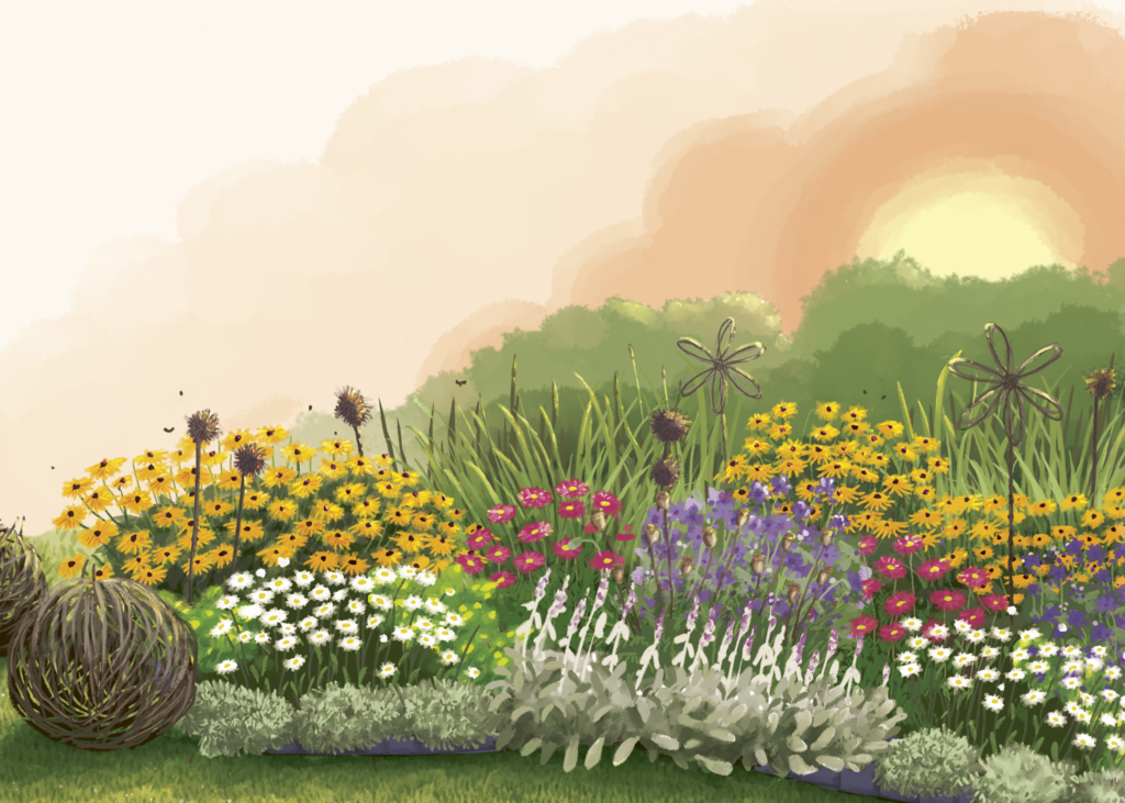 Auringossa hehkuva istutus kootaan perennoista, joiden kukat leiskuvat kilpaa kirkkaissa väreissä. Hopealehtiset kasvit rauhoittavat ja reunustavat villin vapaata kukkatykitystä. Ota talteen valmis istutussuunnitelma kasvilistoineen!